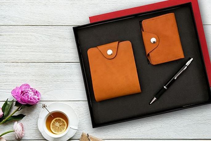 ست چرم طبیعی شامل کیف جیبی ، جاکارتی و خودکار فلزی، چرم طبیعی گاوی